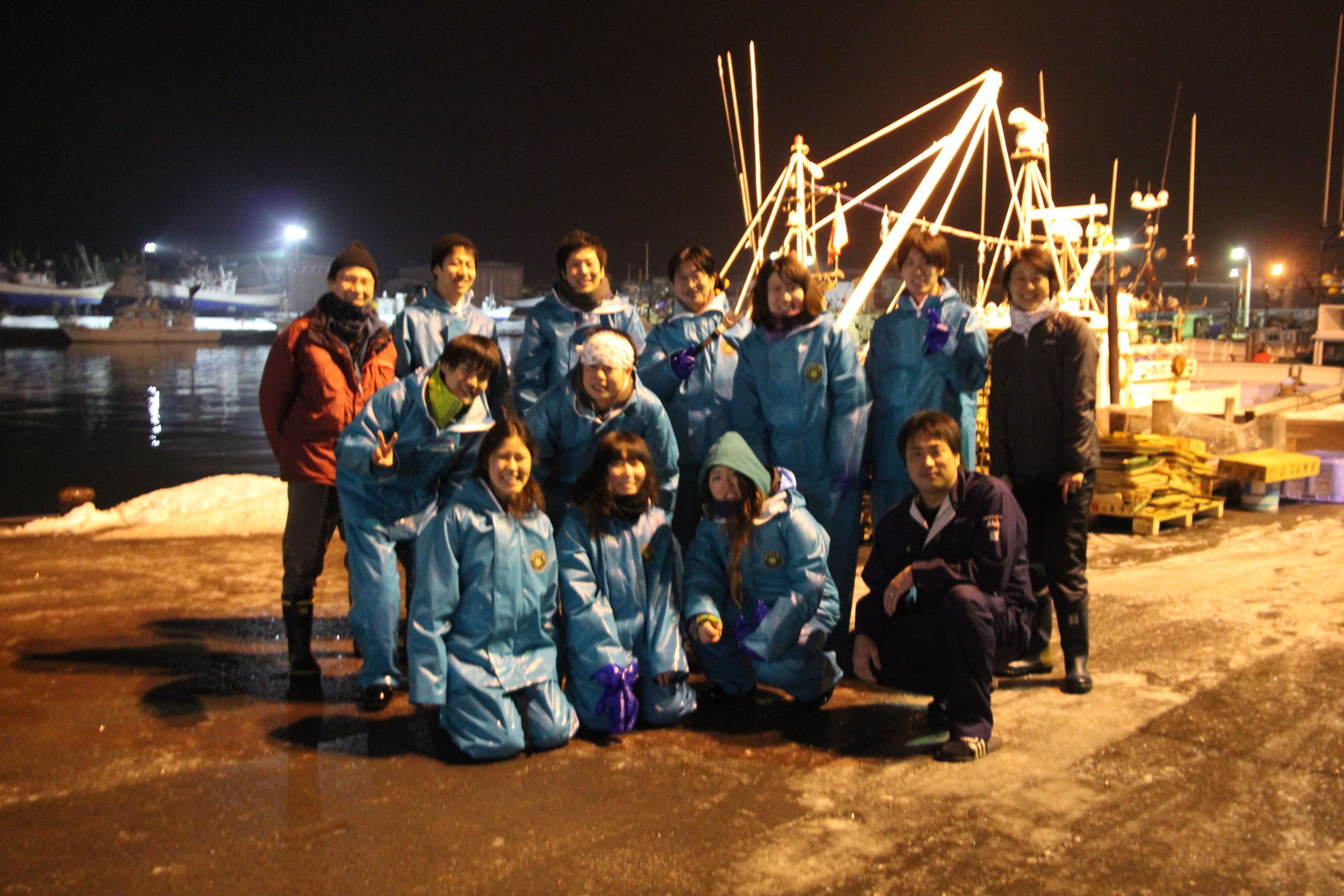 今回の体験では、日頃まず見ることのない、漁業の作業環境、重労働を体験するとともに、漁業協同組合の方から漁業の現状をお聞きし、問題点などをディスカッションするものです。体験は夜中の2時~3時、ディスカッションは3時~4時と、ほぼ徹夜に近い状態で挑みました。